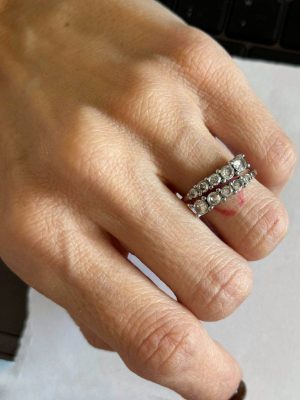 Con il suo doppio filo di zirconi scintillanti, questo anello in acciaio inossidabile cattura la luce ad ogni gesto, aggiungendo un tocco di magia anche ai momenti più ordinari.