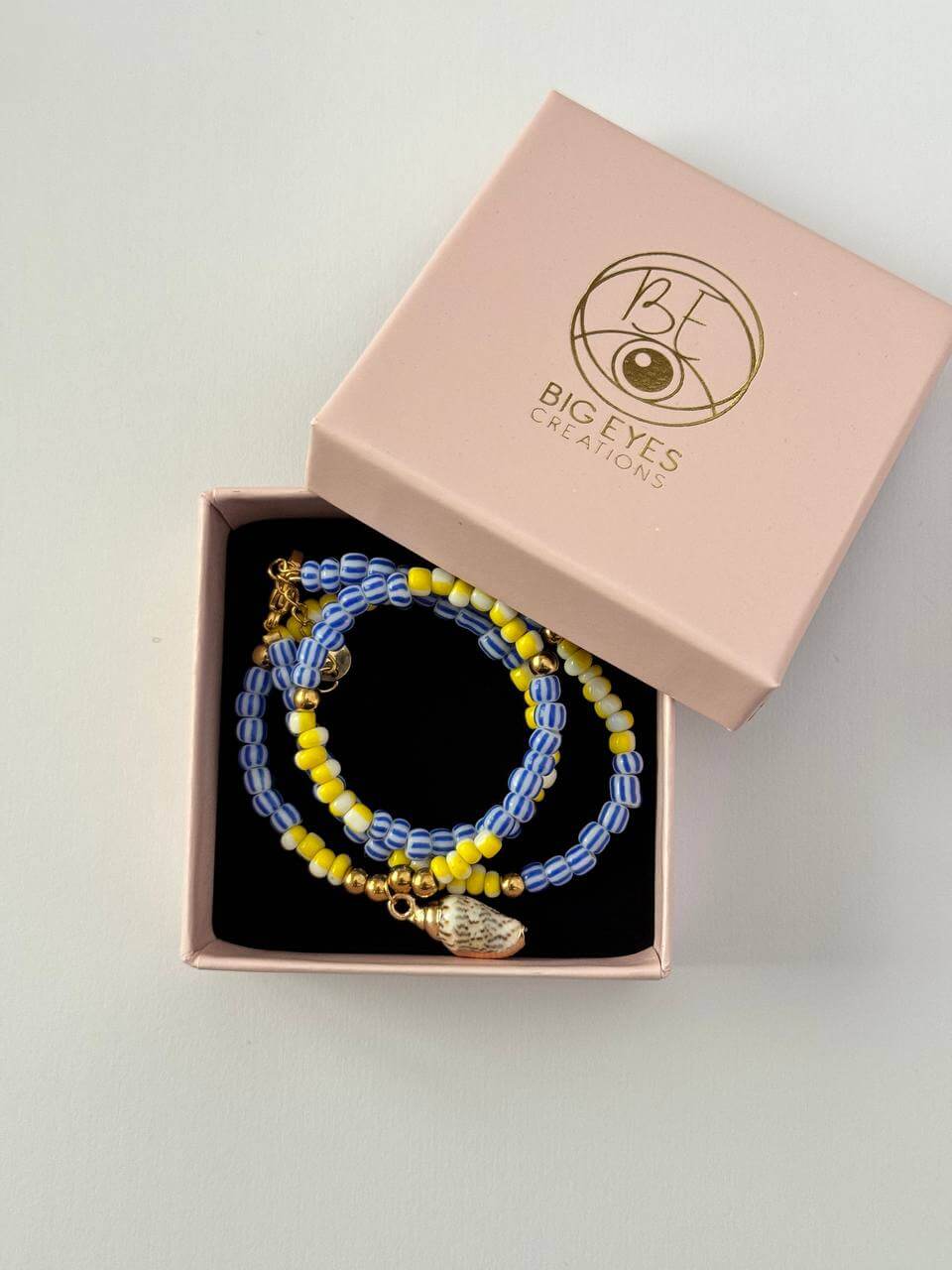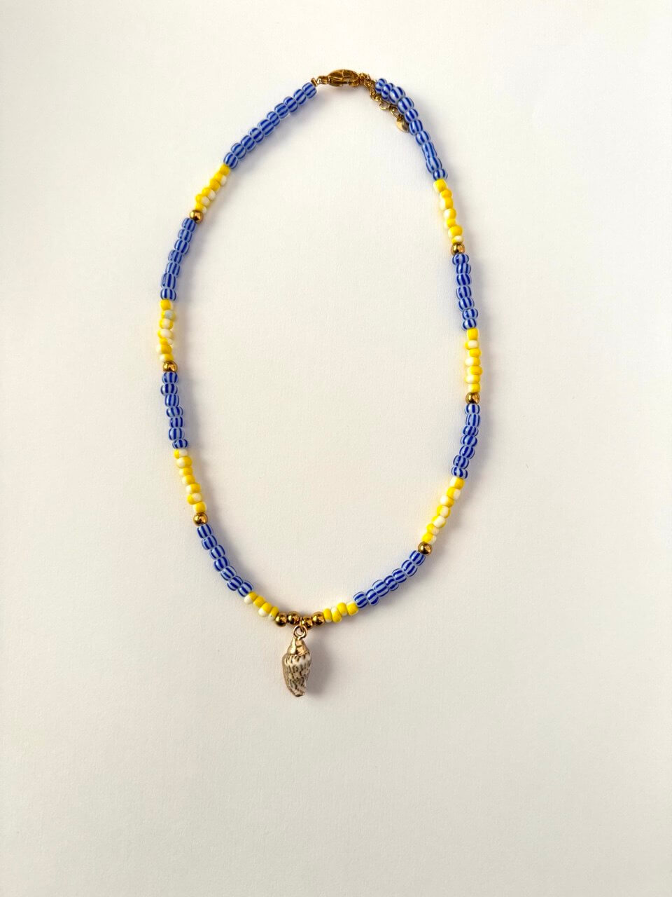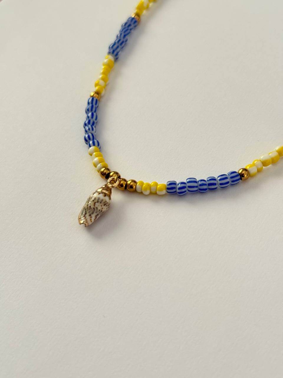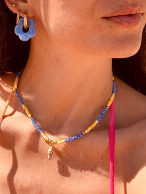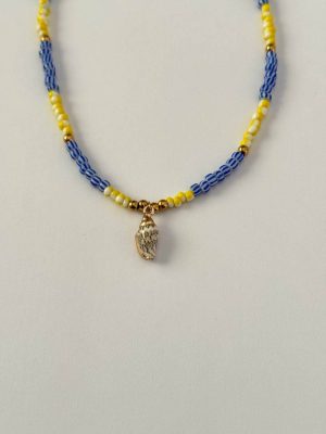 Realizzata con perline rigate blu alternate a perline rigate gialle solari, la Shell cattura l’attenzione con la sua armonia di colori vivaci, mentre al centro si fa notare una delicata conchiglia, simbolo di avventure e sogni da spiaggia.