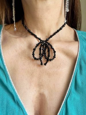 Il nero intenso delle perline cattura la luce e crea riflessi eleganti, mentre il design a fiocco aggiunge un tocco giocoso e raffinato, rendendo questa collana ideale sia per un look da giorno sia per una serata speciale.