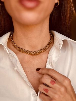 Il suo intreccio geometrico e deciso abbraccia il collo come un’armatura dorata: elegante, sicura, impossibile da ignorare.