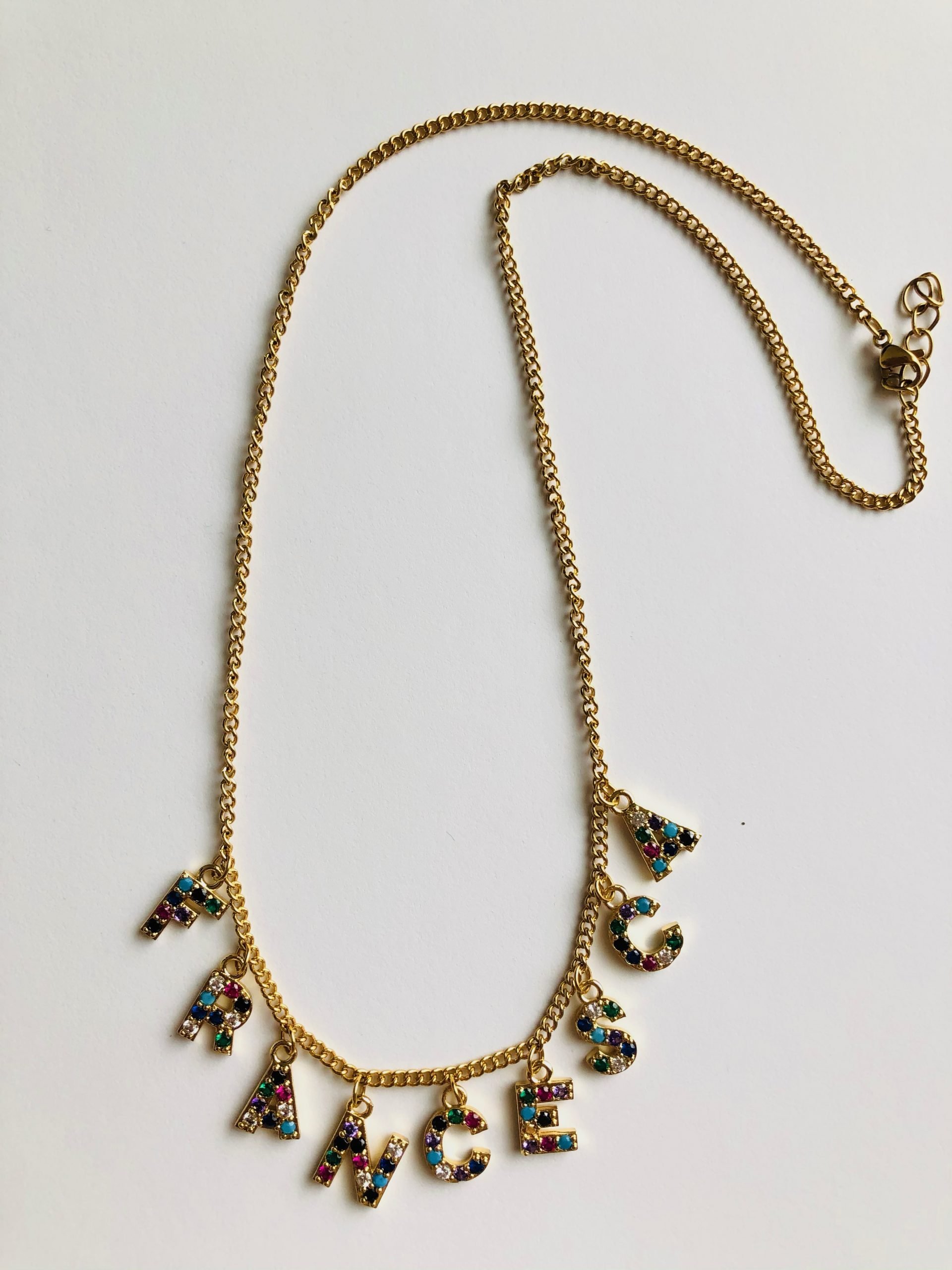 Collana in metallo placcato oro. Lettere pendenti in rame placcato oro con zirconi colorati. Misura 46 cm.