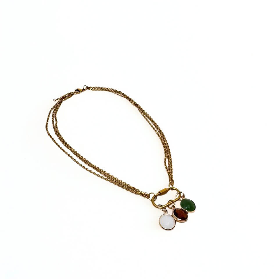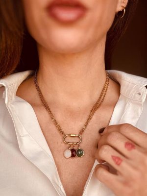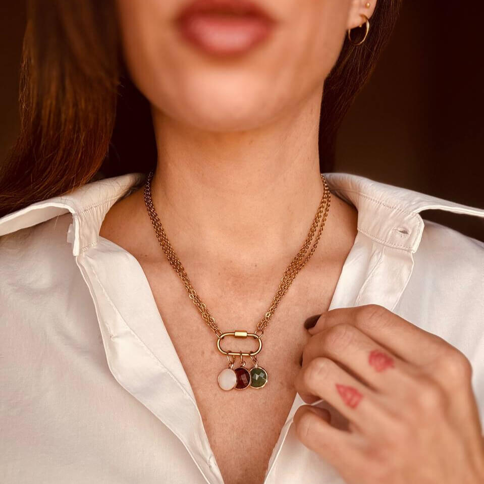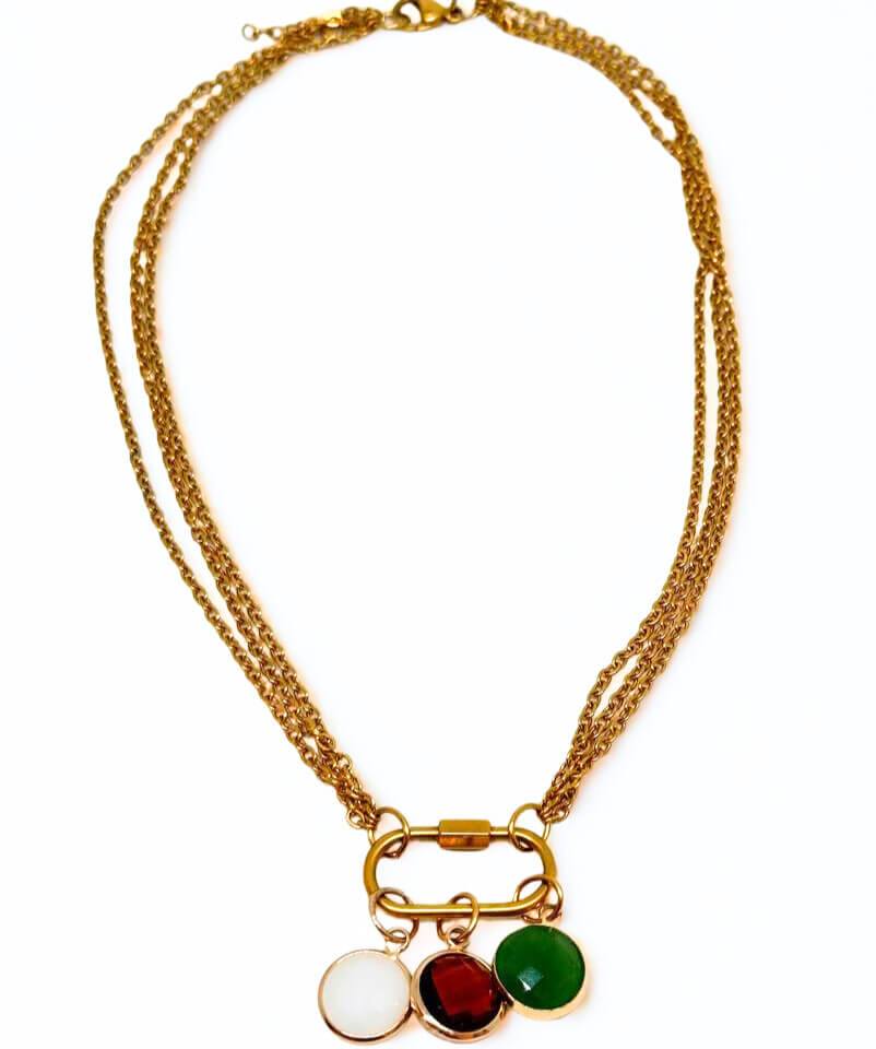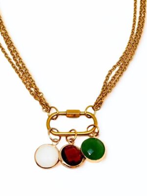 Un design deciso ma armonico: le tre catene dorate si intrecciano con eleganza intorno al collo, mentre i tre charm colorati – rosso, bianco e verde – aggiungono quel dettaglio che cattura senza chiedere attenzione.