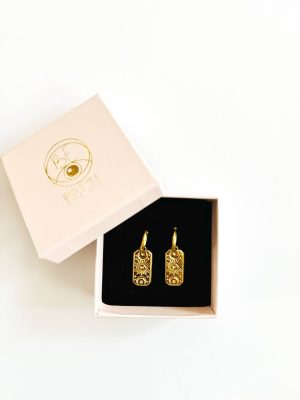 Realizzati con cerchi in acciaio dorato, questi orecchini si distinguono per il loro design intramontabile e versatile. Il vero protagonista è il pendente Talismano in ottone dorato, un simbolo di protezione e fortuna che dona un tocco di magia e mistero al tuo stile quotidiano.