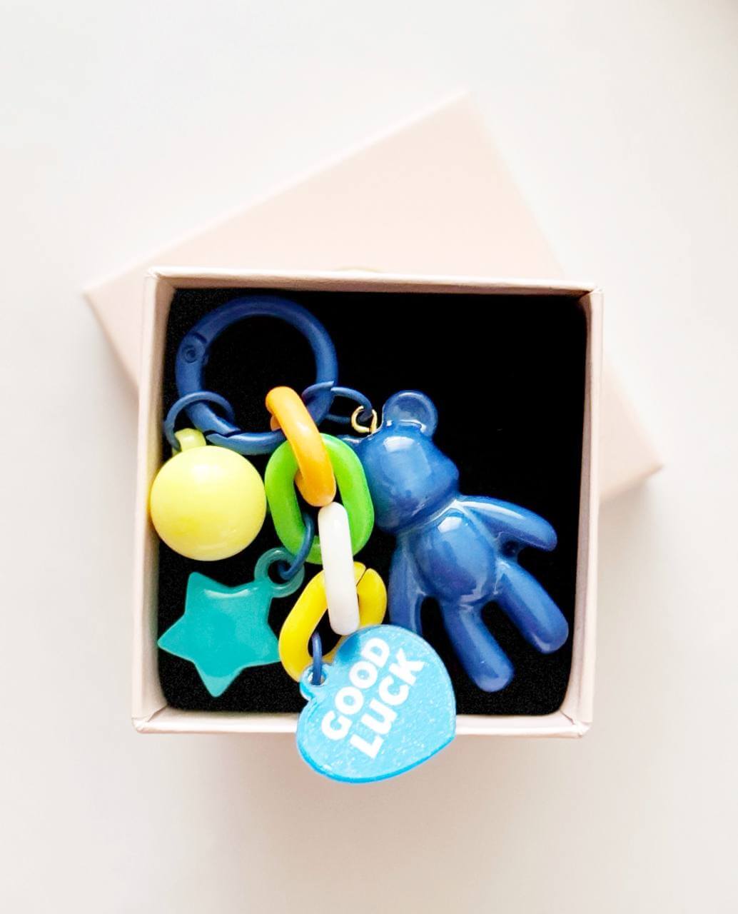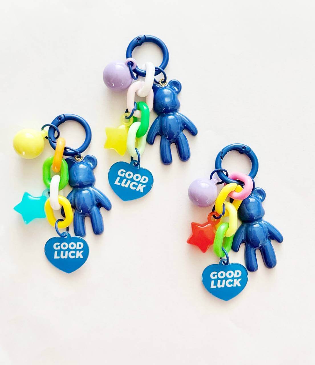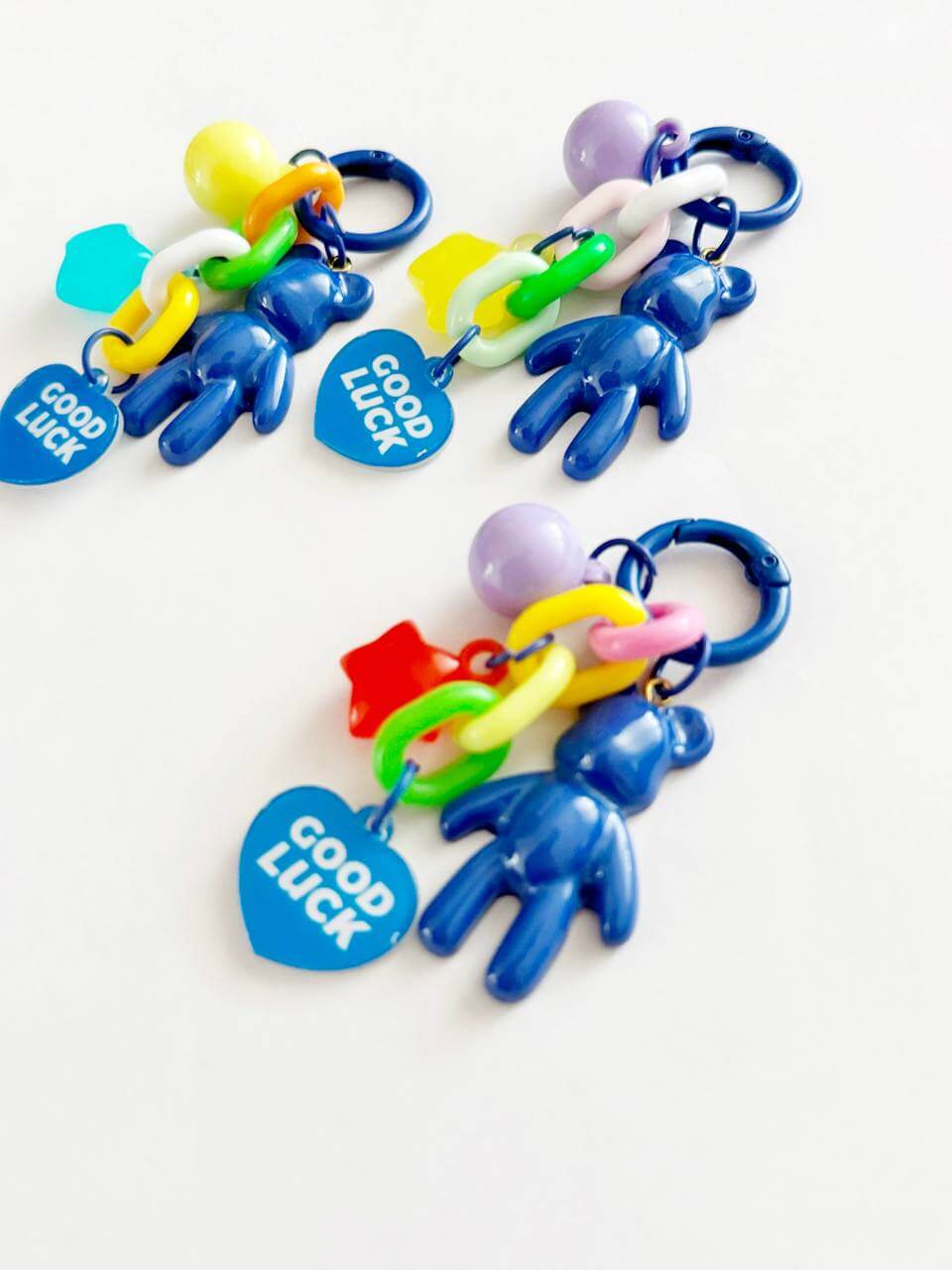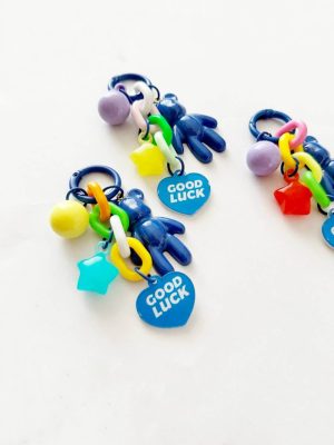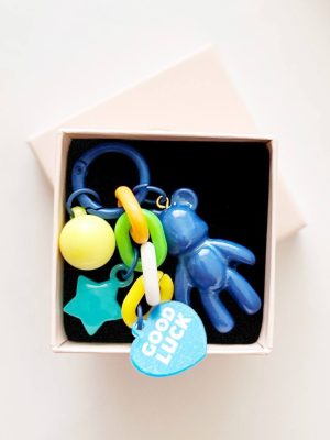 Realizzato in plastica resistente, il portachiavi presenta charms colorati tra cui un orsetto glossy, un cuore portafortuna con la scritta “Good Luck”, anelli colorati e dettagli in rilievo, per un look giocoso e distintivo. Ogni elemento è pensato per creare un mix contemporaneo che rappresenta originalità e allegria.